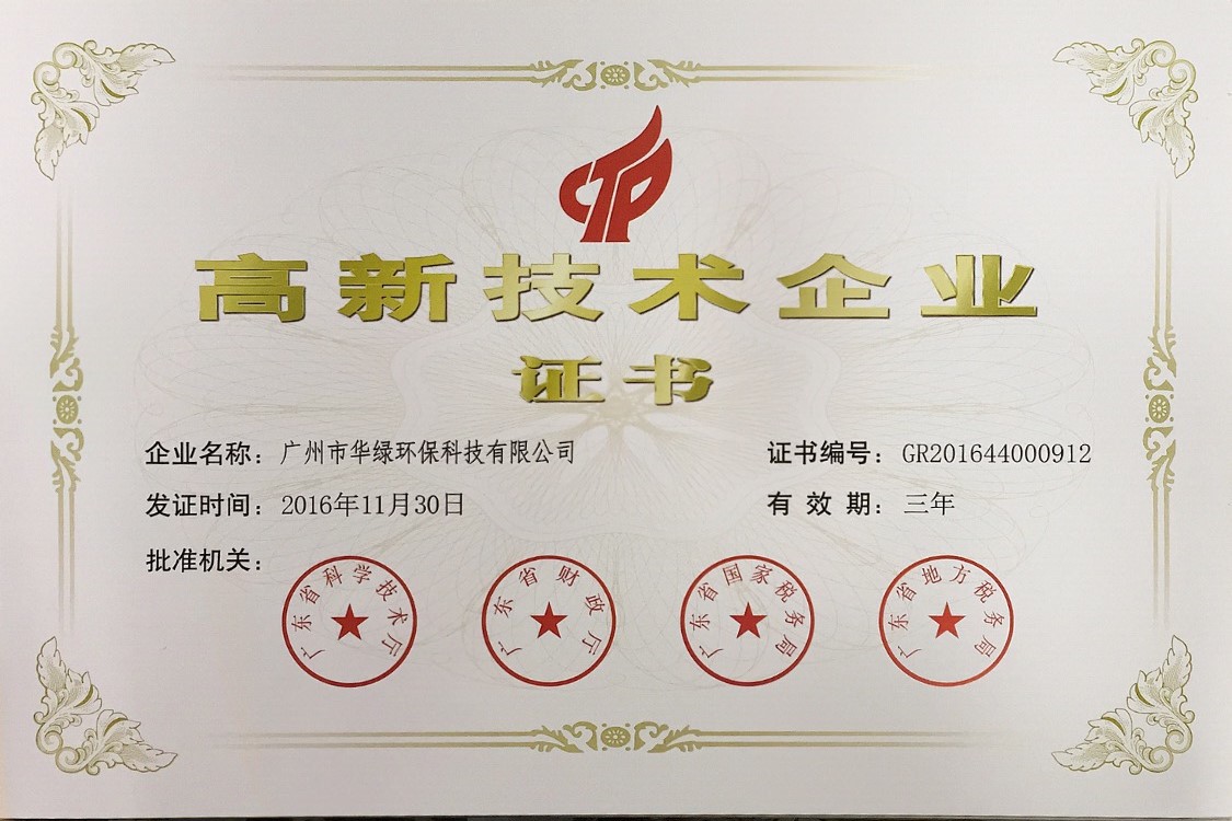 日前,廣州市華綠環保科技有限公司獲得了由廣東省科技廳、廣東省財政廳、廣東省國家稅務局、廣東省地方稅務局聯合頒發的《高新技術企業證書》及牌匾,公司被認定為高新技術企業。